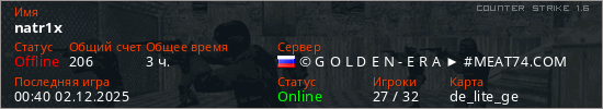 Играет на Counter Strike 1.6 сервере. Страна: РоссияПервый раз замечен 01:14 17.01.2023