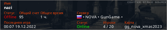 Играет на Counter Strike Source сервере. Страна: РоссияПервый раз замечен 15:15 11.09.2022
