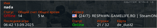 Играет на Counter Strike 1.6 сервере. Страна: СШАПервый раз замечен 06:38 13.09.2025