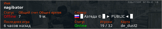 Играет на Counter Strike 1.6 сервере. Страна: РоссияПервый раз замечен 09:36 25.04.2026