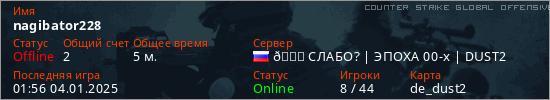 Играет на Counter Strike Global Offensive сервере. Страна: РоссияПервый раз замечен 01:54 04.01.2025