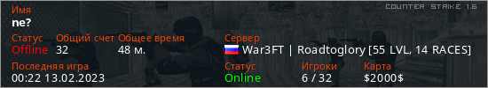 Играет на Counter Strike 1.6 сервере. Страна: РоссияПервый раз замечен 23:37 12.02.2023