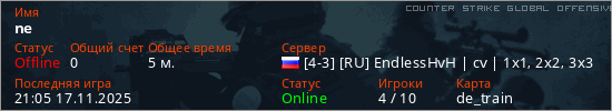 Играет на Counter Strike Global Offensive сервере. Страна: РоссияПервый раз замечен 20:40 17.11.2025
