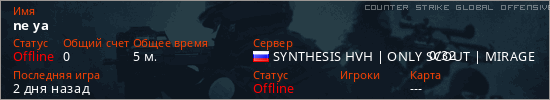 Играет на Counter Strike Global Offensive сервере. Страна: РоссияПервый раз замечен 17:26 06.02.2026