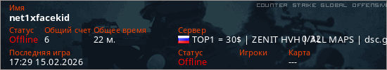 Играет на Counter Strike Global Offensive сервере. Страна: РоссияПервый раз замечен 20:56 14.02.2026