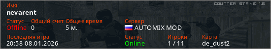 Играет на Counter Strike 1.6 сервере. Страна: РоссияПервый раз замечен 20:47 08.01.2026
