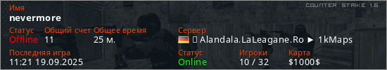 Последний раз был в сети 11:21 19.09.2025 Игрок с таким ником замечен на 30 серверах