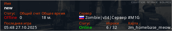 Играет на Counter Strike Source сервере. Страна: РоссияПервый раз замечен 21:43 05.07.2025