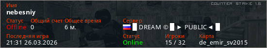Играет на Counter Strike 1.6 сервере. Страна: РоссияПервый раз замечен 21:28 26.03.2026