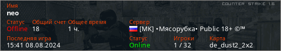 Играет на Counter Strike 1.6 сервере. Страна: РоссияПервый раз замечен 13:44 18.07.2023