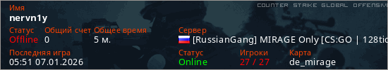 Играет на Counter Strike Global Offensive сервере. Страна: РоссияПервый раз замечен 05:28 07.01.2026