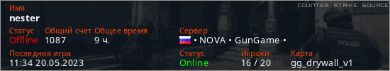 Играет на Counter Strike Source сервере. Страна: РоссияПервый раз замечен 15:50 21.09.2022