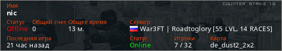 Последний раз был в сети 13 часов назад Игрок с таким ником замечен на 11 серверах
