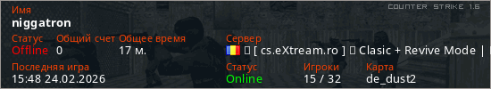 Играет на Counter Strike 1.6 сервере. Страна: РумынияПервый раз замечен 10:01 24.02.2026