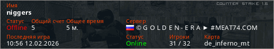 Играет на Counter Strike 1.6 сервере. Страна: РоссияПервый раз замечен 10:54 12.02.2026