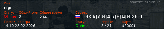 Играет на Counter Strike 1.6 сервере. Страна: РоссияПервый раз замечен 13:59 28.02.2026