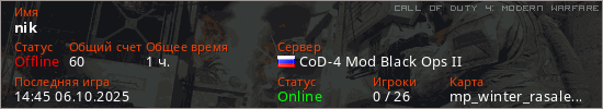Играет на Call of Duty 4: Modern Warfare сервере. Страна: РоссияПервый раз замечен 14:15 09.06.2024