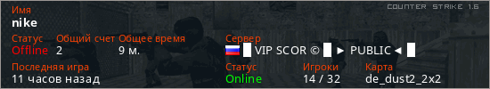 Играет на Counter Strike 1.6 сервере. Страна: РоссияПервый раз замечен 23:51 11.03.2026
