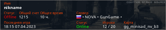 Играет на Counter Strike Source сервере. Страна: РоссияПервый раз замечен 19:23 02.09.2022