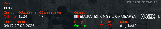 Играет на Counter Strike 1.6 сервере. Страна: ФранцияПервый раз замечен 04:00 20.03.2026