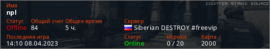 Играет на Counter Strike Source сервере. Страна: РоссияПервый раз замечен 15:49 27.01.2023
