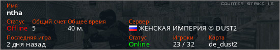 Играет на Counter Strike 1.6 сервере. Страна: РоссияПервый раз замечен 17:06 05.02.2026