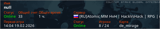 Играет на Counter Strike Global Offensive сервере. Страна: РоссияПервый раз замечен 14:04 19.02.2026