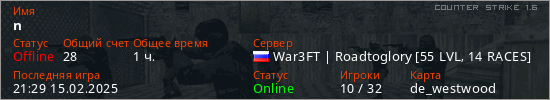 Играет на Counter Strike 1.6 сервере. Страна: РоссияПервый раз замечен 17:46 17.11.2022