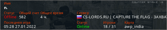 Играет на Counter Strike 1.6 сервере. Страна: РоссияПервый раз замечен 01:30 27.01.2022