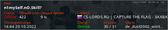 Играет на Counter Strike 1.6 сервере. Страна: РоссияПервый раз замечен 13:23 20.05.2022