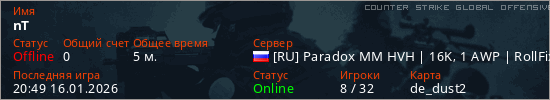 Играет на Counter Strike Global Offensive сервере. Страна: РоссияПервый раз замечен 20:40 16.01.2026