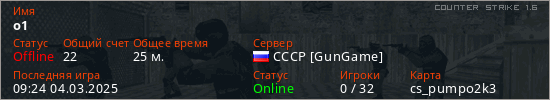 Играет на Counter Strike 1.6 сервере. Страна: РоссияПервый раз замечен 22:47 04.01.2024
