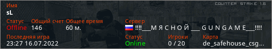 Играет на Counter Strike 1.6 сервере. Страна: РоссияПервый раз замечен 21:24 15.07.2022