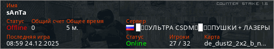 Играет на Counter Strike 1.6 сервере. Страна: РоссияПервый раз замечен 08:57 24.12.2025