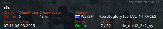 Играет на Counter Strike 1.6 сервере. Страна: РоссияПервый раз замечен 16:05 13.09.2022