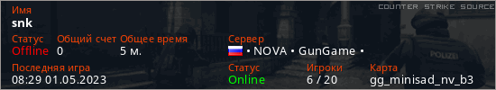 Играет на Counter Strike Source сервере. Страна: РоссияПервый раз замечен 08:27 01.05.2023