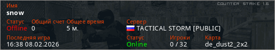 Играет на Counter Strike 1.6 сервере. Страна: РоссияПервый раз замечен 16:17 08.02.2026