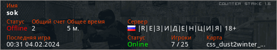 Играет на Counter Strike 1.6 сервере. Страна: РоссияПервый раз замечен 00:29 04.02.2024