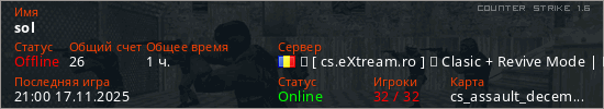 Играет на Counter Strike 1.6 сервере. Страна: РумынияПервый раз замечен 03:24 12.05.2025
