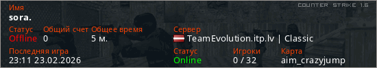 Играет на Counter Strike 1.6 сервере. Страна: ЛатвияПервый раз замечен 22:56 23.02.2026