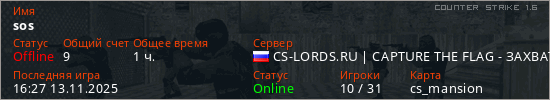 Последний раз был в сети 16:27 13.11.2025 Игрок с таким ником замечен на 33 серверах