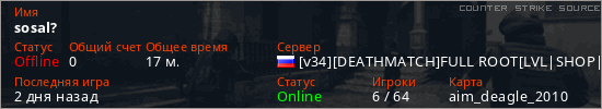 Играет на Counter Strike Source сервере. Страна: РоссияПервый раз замечен 23:05 28.12.2024