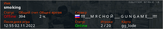 Играет на Counter Strike 1.6 сервере. Страна: РоссияПервый раз замечен 20:44 31.10.2022