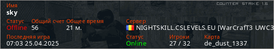 Последний раз был в сети 07:03 25.04.2025 Игрок с таким ником замечен на 52 серверах