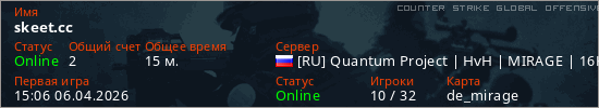 Играет на Counter Strike Global Offensive сервере. Страна: РоссияПервый раз замечен 15:06 06.04.2026