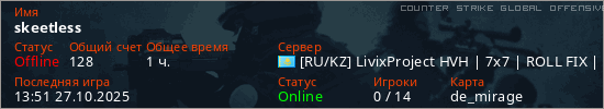 Играет на Counter Strike Global Offensive сервере. Страна: КазахстанПервый раз замечен 14:29 25.07.2025