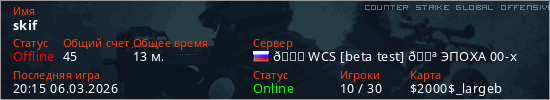 Играет на Counter Strike Global Offensive сервере. Страна: РоссияПервый раз замечен 17:53 06.03.2026