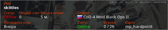 Играет на Call of Duty 4: Modern Warfare сервере. Страна: РоссияПервый раз замечен 22:00 14.02.2026