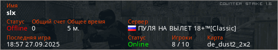 Играет на Counter Strike 1.6 сервере. Страна: РоссияПервый раз замечен 18:53 27.09.2025