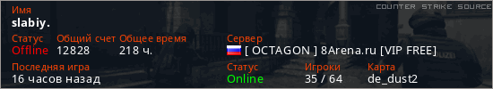 Играет на Counter Strike Source сервере. Страна: РоссияПервый раз замечен 11:22 31.05.2022